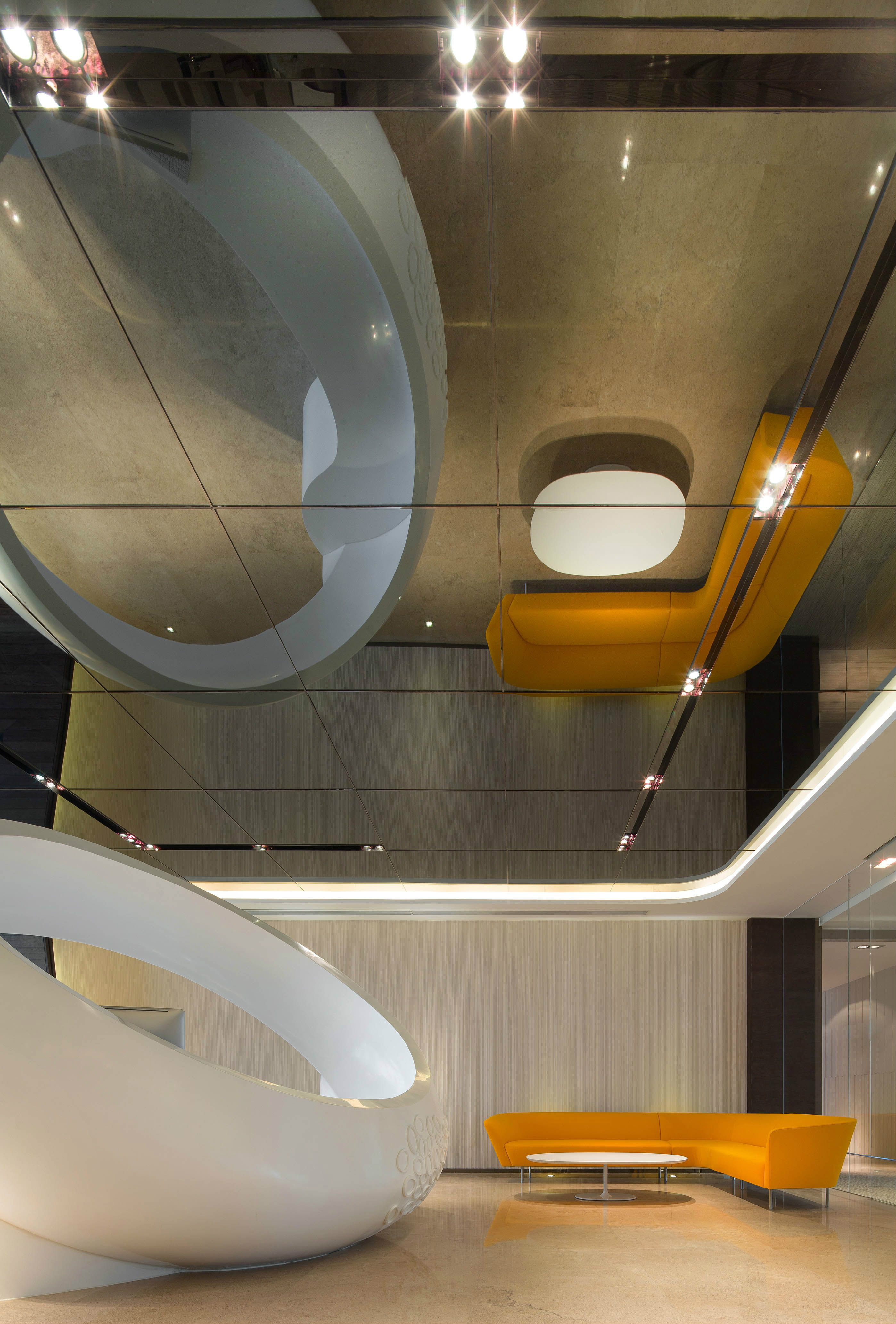 4300平米醫(yī)療公司辦公空間設(shè)計(jì)布局,平靜的色彩、柔軟的面料和以類似色調(diào)選擇的彎曲形式提供了所需的寬敞和平靜的氛圍。彎曲的墻壁從入口連續(xù)延伸,增強(qiáng)了空間的連續(xù)性,并通過(guò)在墻壁內(nèi)創(chuàng)建的彩色壁龕創(chuàng)建了咖啡店區(qū)域等功能區(qū)域。